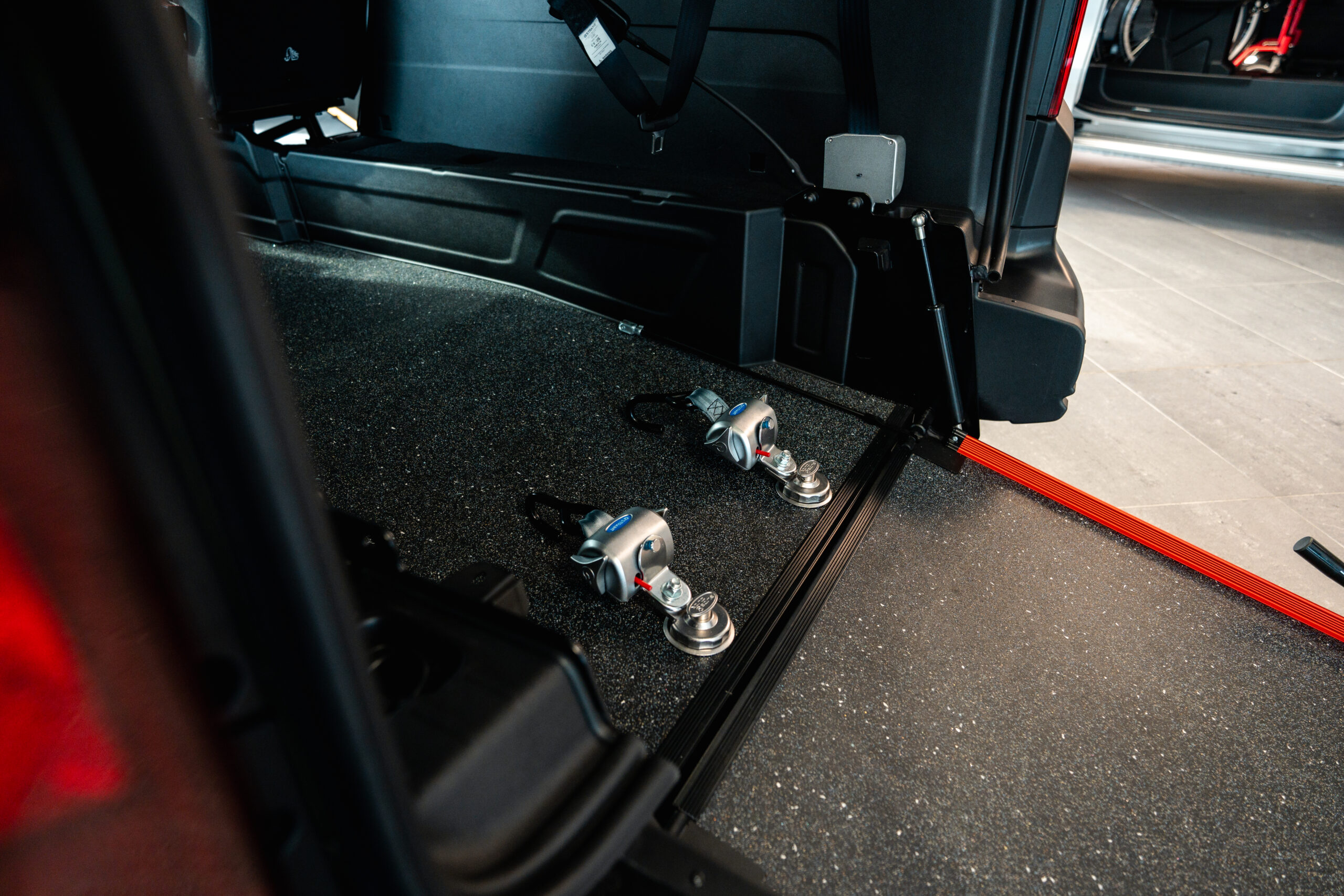 - Veilige en stabiele rolstoelbevestiging met elektrische en manuele vergrendelingen en een driepuntsgordel